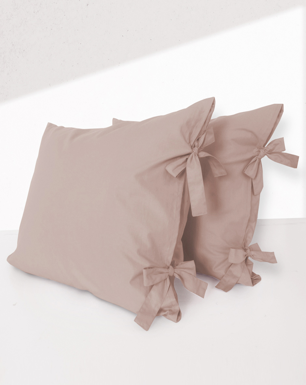 Set de 2 fundas de almohadas 260 hilos 70% algodón pima peruano 30% poliéster. El modelo es tipo sobre con lazos a los costados.